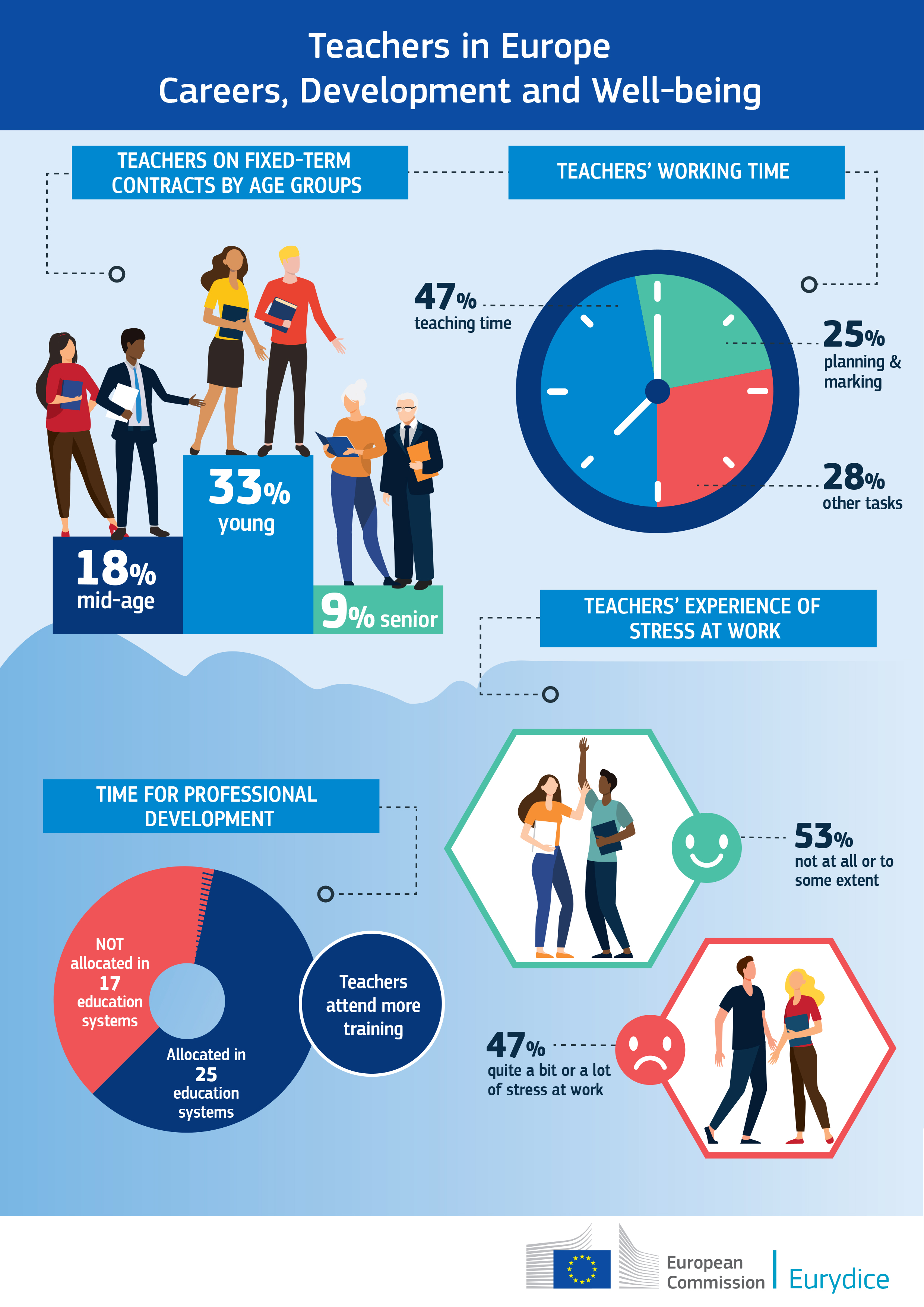 Почти половината от учителите в Европа алармират за високи нива на стрес, свързан с работата. Учителите съобщават, че административните задачи, променящите се изисквания от властите и отговорността за постиженията на учениците са основен източник на стрес. По-високите му нива са свързани и с оценката за кариерно развитие, по-дългото работно време, лошото поведение на учениците и по-ниските нива на самоувереност в управлението на учениците. По-ниските нива на стрес пък са свързани с продължаващото професионално развитие за прогрес в кариерата, училищния климат на сътрудничество, чувството за автономност и самочувствието при мотивиране на учениците.