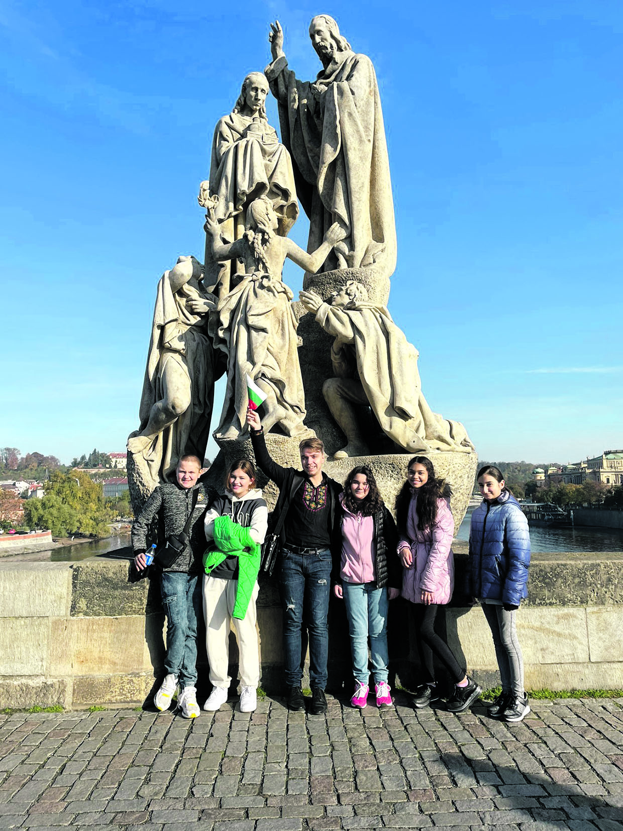 Марио Огнянов води шестокласниците при паметника на светите братя Кирил и Методий на Карловия мост