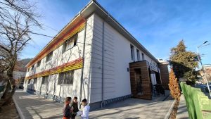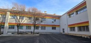 Така изглежда пловдивското ОУ „Екзарх Антим I“, чиято сграда е напълно реновирана и модернизирана с 5 млн. лева по Националния план за възстановяване и устойчивост. Новата визия на фасадата е решена в сиво и жълто, с дървен обков на централния вход. След поставяне на изолацията са монтирани и цветни сенници.