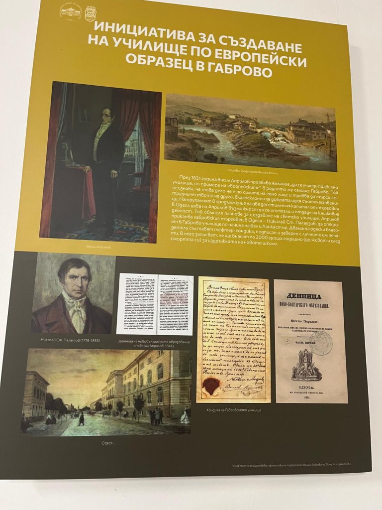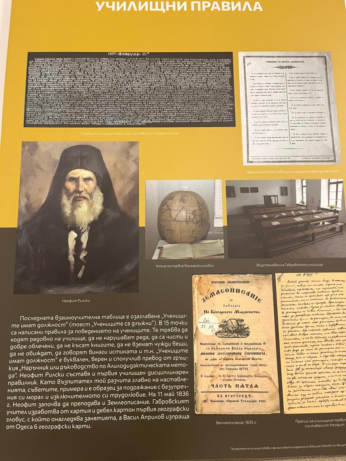 От фотосите може да се научи за делото на Васил Априлов, за първия български учител Неофит Рилски и ролята на Габровското училище, за школата за подготовка на учители и училищните реформи. Могат да се видят първите училищни печати, които се съхраняват в Музея, както и други експонати.