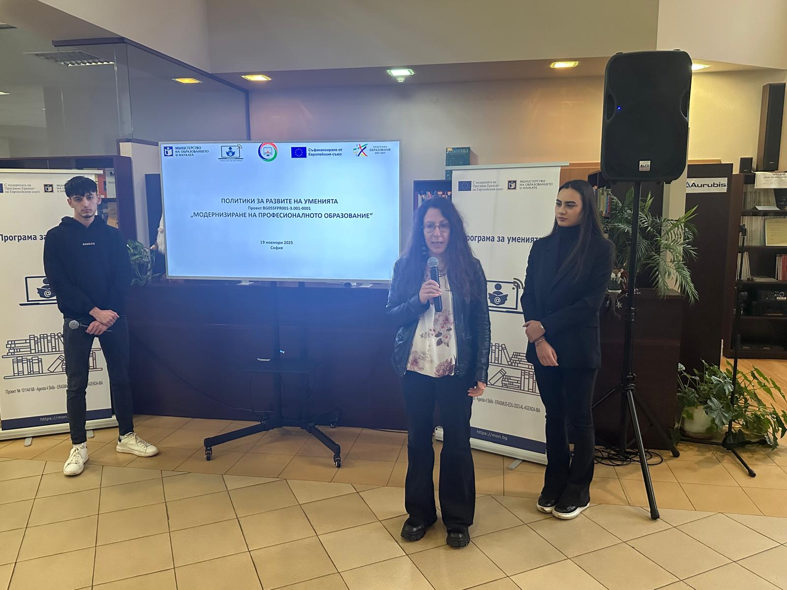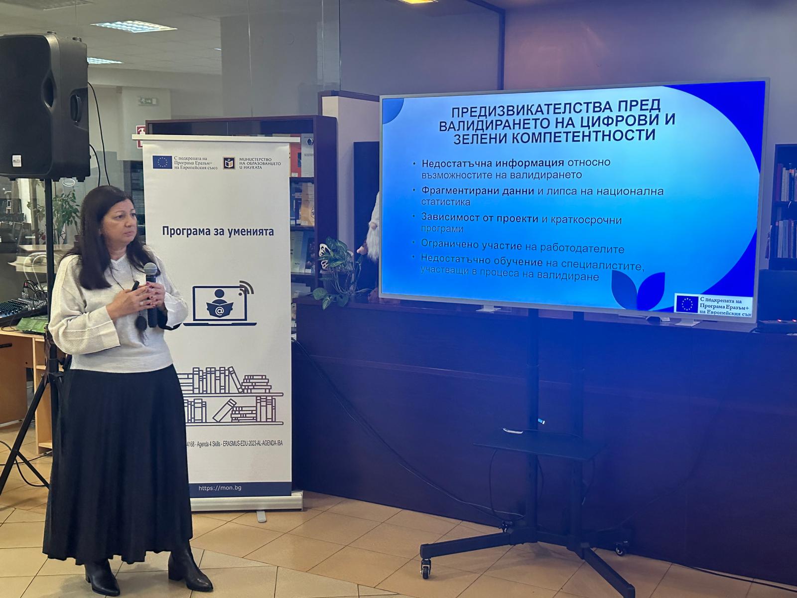 Весела Караянева – главен експерт в МОН, съобщи актуална информация по разработването на учебна документация по новия списък на професиите за професионално образование и обучение, които са за ученици и за възрастни. Тя представи и дейностите по проекта „Модернизация на професионалното образование“ и политиките на МОН в тази област. Те включват и улеснена процедура за валидиране на уменията. Чрез нея се осигурява възможност на хора с професионален опит в определена област, които нямат формално образование и диплома, да получат удостоверение за своите компетентности. Това става, след като се явят на изпит или преминат през кратко обучение.