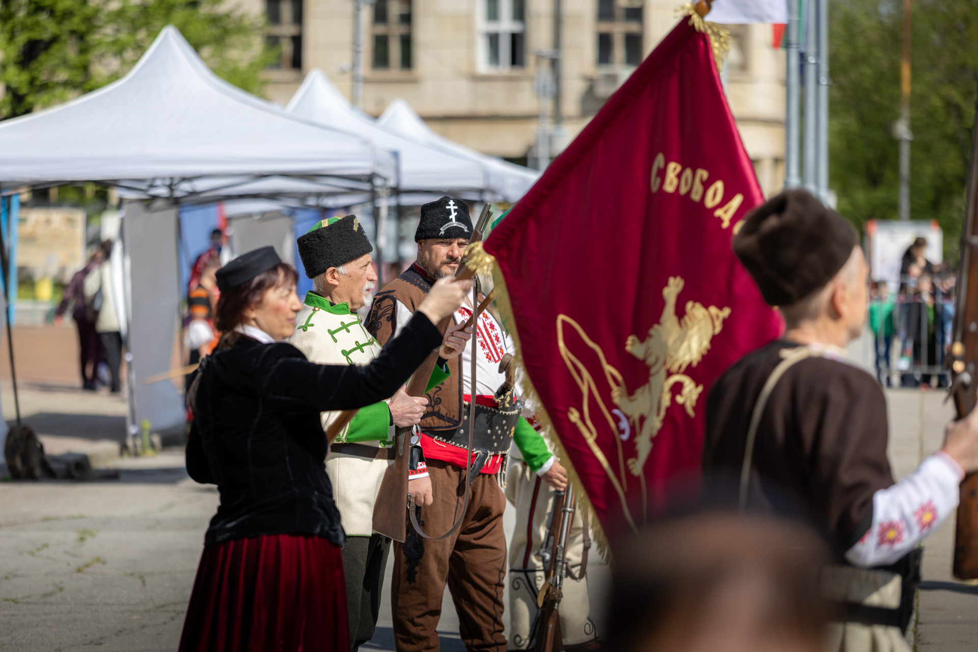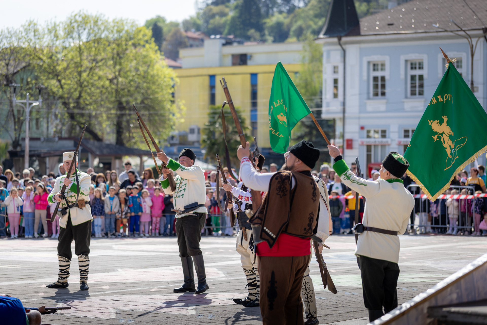 С песни, знамена и чувство за принадлежност те преминаха през Кюстендил и достигнаха центъра, където се проведе въздействащата историческа възстановка „Първа пушка“. Тя беше представена от Регионалния клуб „Традиция“ към НЧ „Ген. Владимир Заимов“.
