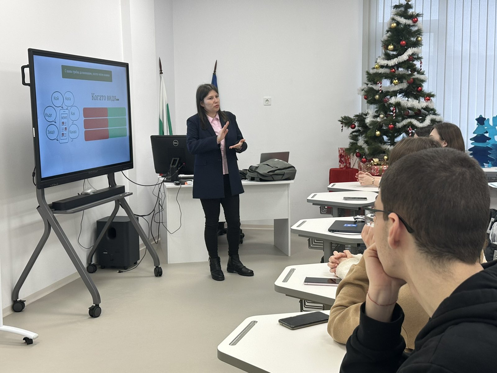 Тема на заниманията бе и как работят алгоритмите на TikTok, Instagram и YouTube, както и монетизирането на клипове в социалните мрежи. Учениците активно споделяха примери по дискутираните въпроси. Заниманието приключи с творческа задача, като участниците в открития урок бяха разделени на групи.