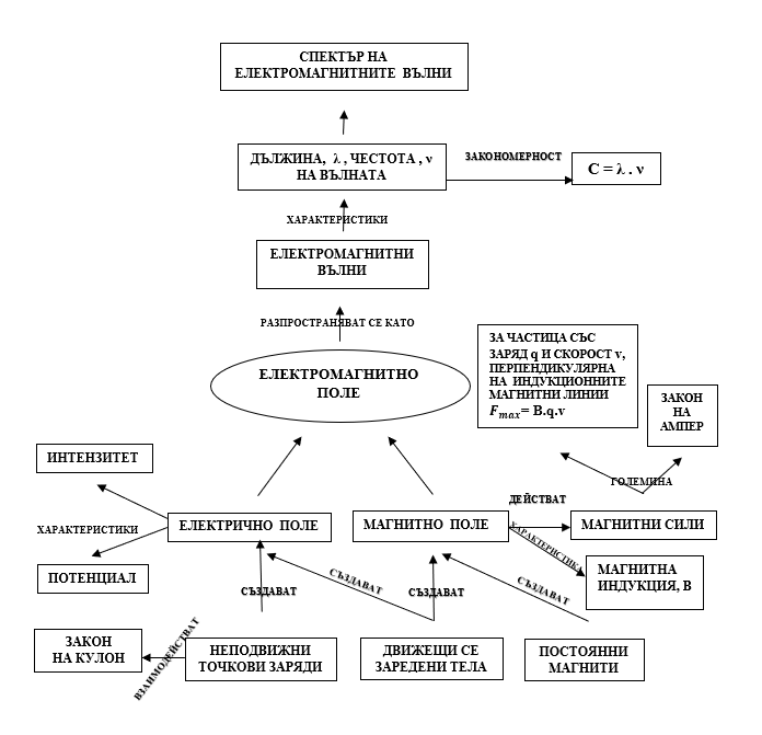 Концептуалната карта включва физични обекти (точков заряд, електрично поле, магнитно поле, електромагнитни вълни), физични величини (интензитет и потенциал на електростатичното поле,  силите, с които електричното и магнитното поле действат върху заряди, индукция на магнитното поле), зависимости между величините, характеристики на електромагнитните вълни.