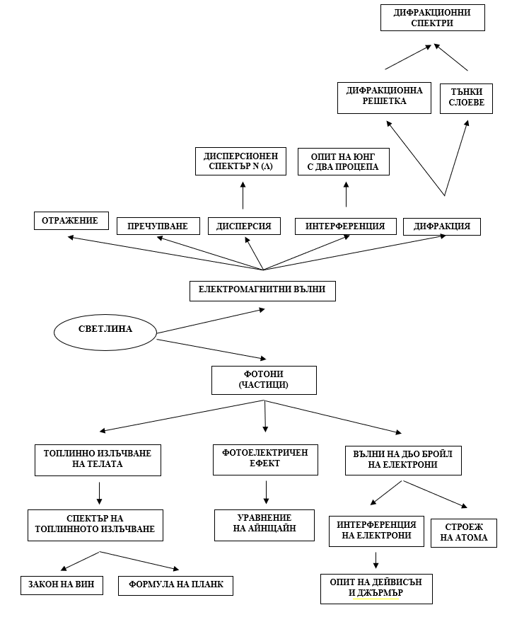 Вълновите и корпускулярни светлинни явления са представени в две области на концептуалната карта. Едната област включва вълновите проявления на светлината.  Електромагнитната теория обяснява разпространението на светлината в пространството като вълна и вълнови явления като отражение, пречупване, дисперсия, интерференция и дифракция на светлинните вълни. В V клас учениците учат, че светлината е вид енергия, която се разпространява праволинейно. В VII клас бялата светлина се разглежда като съставена от лъчи с различни цветове, образуващи спектър на светлината (Maximov & Ruseva 2018, p. 56). На границата на две среди наблюдаваме отражение, а на границата на две прозрачни среди с различна оптична плътност наблюдаваме пречупване на светлината (Maximov & Ruseva 2018, pр. 50 – 53). В Х клас учениците разширяват когнитивната си структура със знания за интерференция и дифракция на светлината, доказващи нейната вълнова природа. В картата е включен опитът на Юнг, при който се наблюдават тези вълнови явления (Maximov & Dimitrova 2024 pр. 72 – 75).  Например от VII клас учениците знаят, че светлината се разпространява праволинейно (Maximov & Ruseva 2018, p. 48). В Х клас при изучаване на дифракция тази представа се допълва: при преминаване на светлината през отвори и обекти, съизмерими с нейната дължина на вълната, тя се отклонява от праволинейното си разпространение. Предложената концептуална карта акцентира върху разликата между дисперсионния спектър, получен от стъклена призма, и спектрите, получени от дифракционна решетка и тънки слоеве. Втората област на концептуалната карта от фиг. 2 отразява корпускулярната природа на микрообектите. Законът на Вин е важна закономерност в спектъра на топлинно излъчване на телата. Хипотезата на Макс Планк за дискретните стойности на енергията, пренасяна от електромагнитните вълни, е в основата за обяснението на топлинното излъчване и на фотоелектричния ефект. Фотоните са носители на тази енергия. Формулата на Планк е в основата на обяснението на спектъра на топлинно излъчване на телата и на закономерностите при фотоелектричния ефект. Картата включва уравнението на Айнщайн, което е запис на Закона за запазване на енергията при фотоефекта. Фотоните  проявяват свойства както на частици, така и на вълни (Maximov & Dimitrova 2024, pр. 80 – 85). Хипотезата на Дьо Бройл за вълнови свойства на електроните се потвърждава от опита на Дейвисън и Джърмър с наблюдението на дифракционна картина на електрони. Това е важен елемент от теорията за строежа на атома: на всяка стационарна орбита от атомния модел на Бор съответства стояща кръгова вълна на Дьо Бройл, която се нанася цяло число брой пъти (Maximov & Dimitrova 2024, pр. 94 – 97).