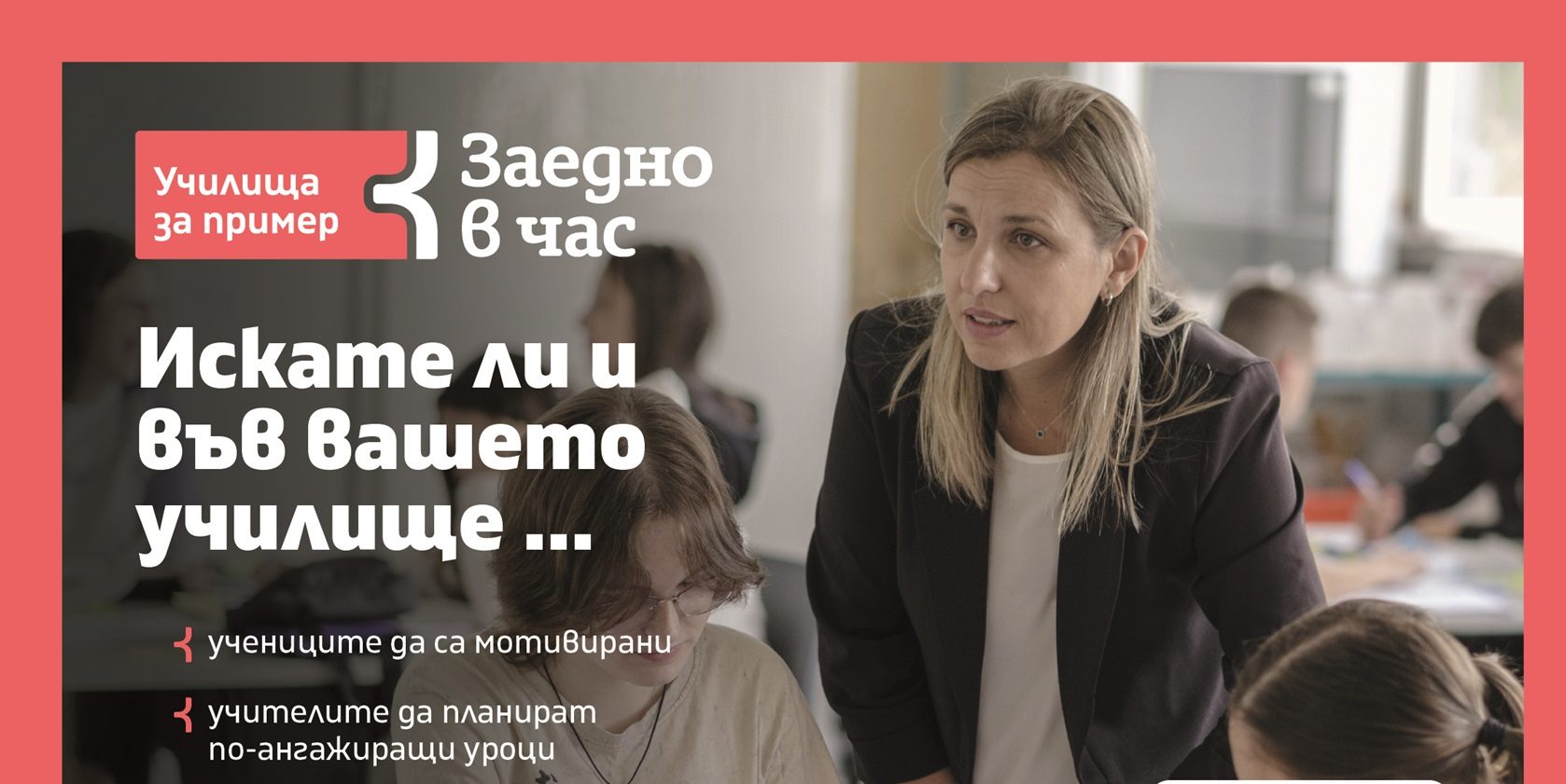 Времето за кандидатстване за „Училища за пример“ изтича на 5 декември. Училищата, които искат да станат част от следващото голямо образователно приключение, могат да научат повече на zaednovchas.bg.