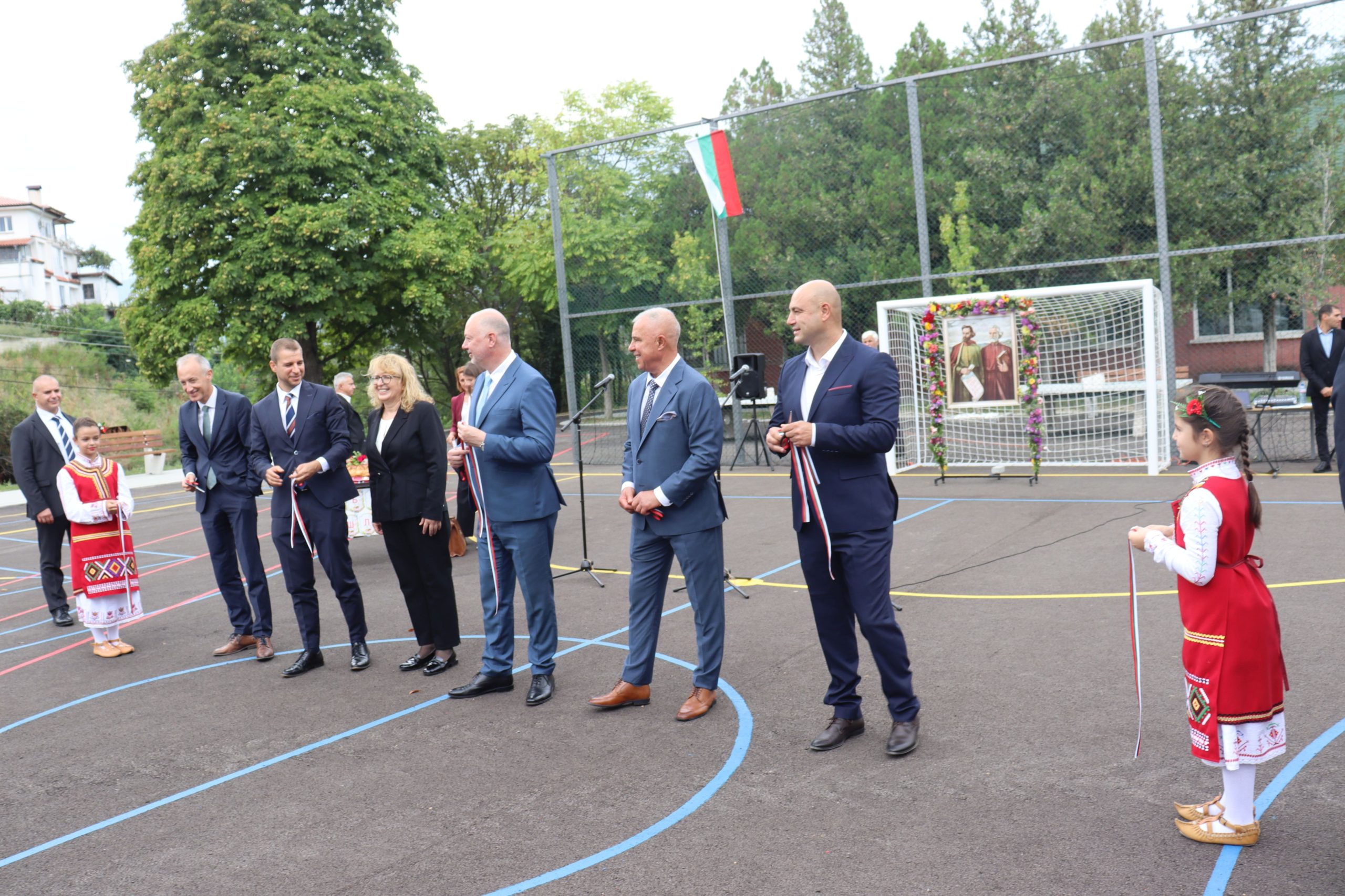 Село Крупник (11 септември 2025) Министър-председателят Росен Желязков, министърът на образованието и науката Красимир Вълчев и министърът на външните работи Георг Георгиев присъстват на откриването на обновеното училище в село Крупник, община Симитли. Снимка: Красимир Николов/БТА (ЛФ)