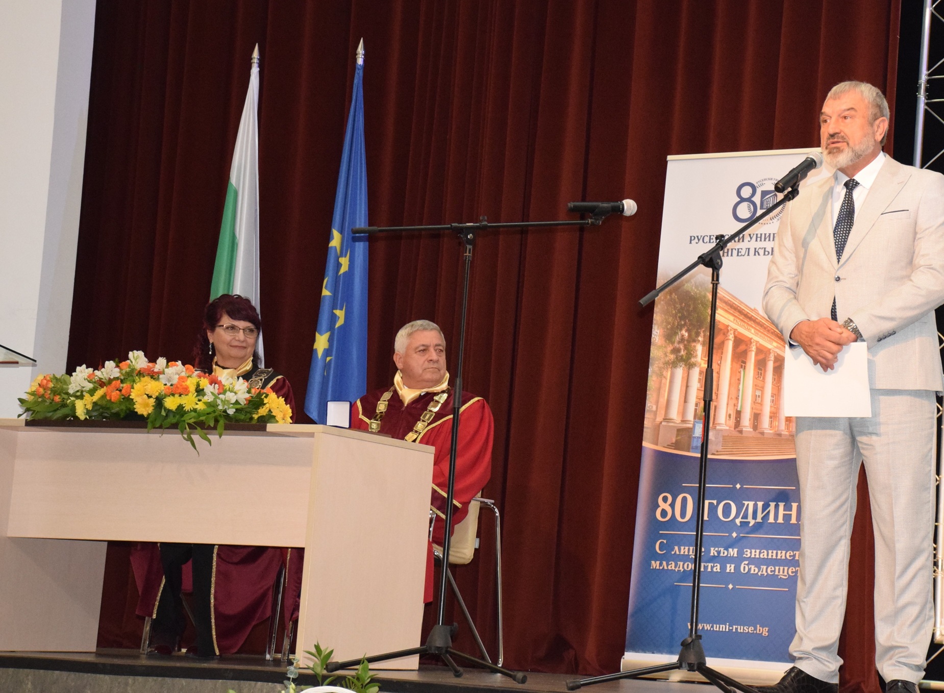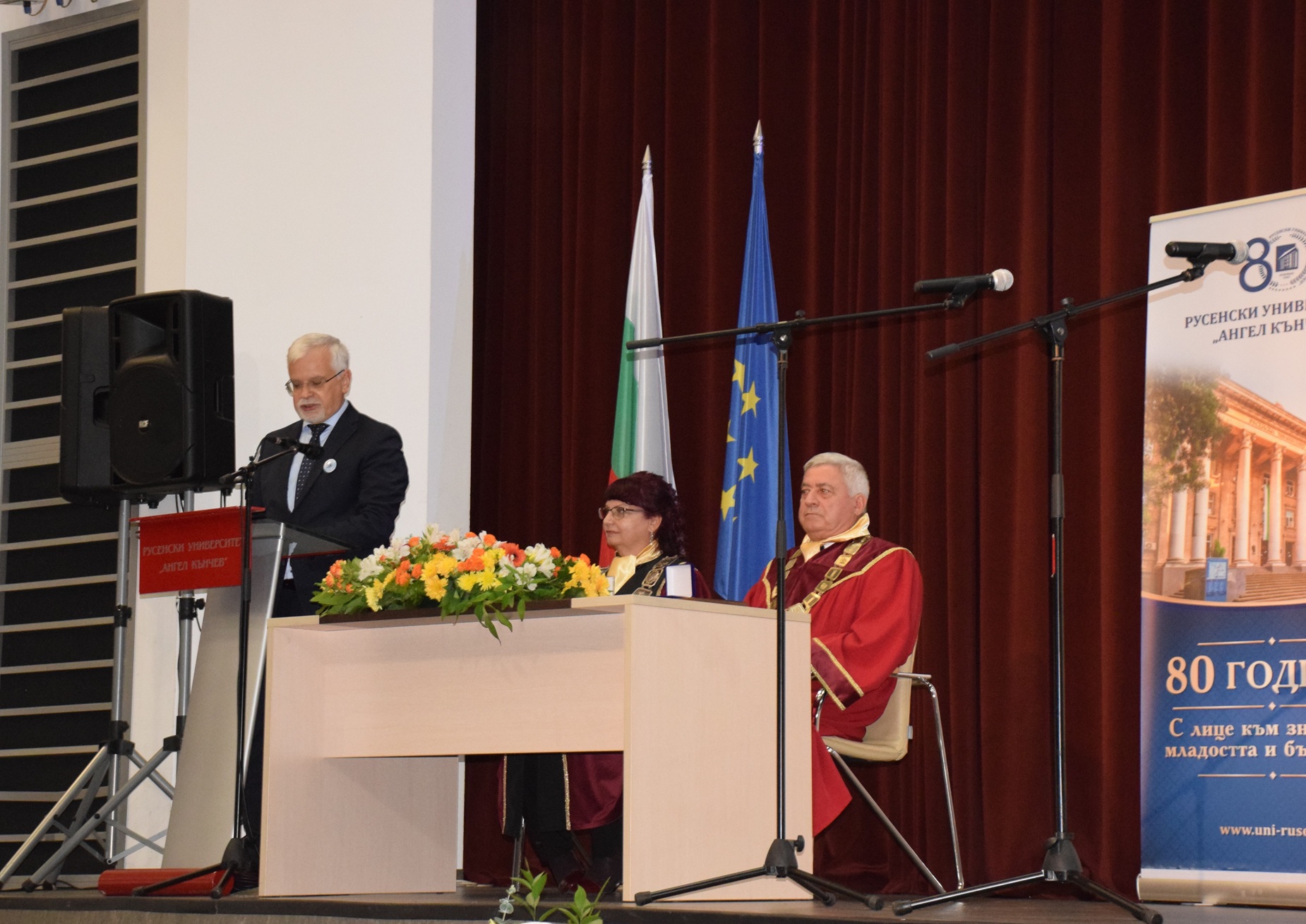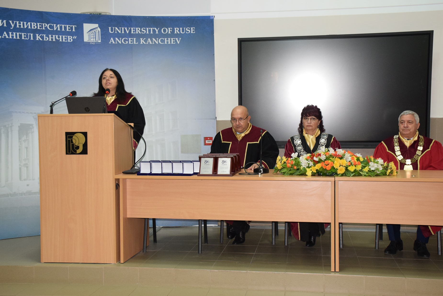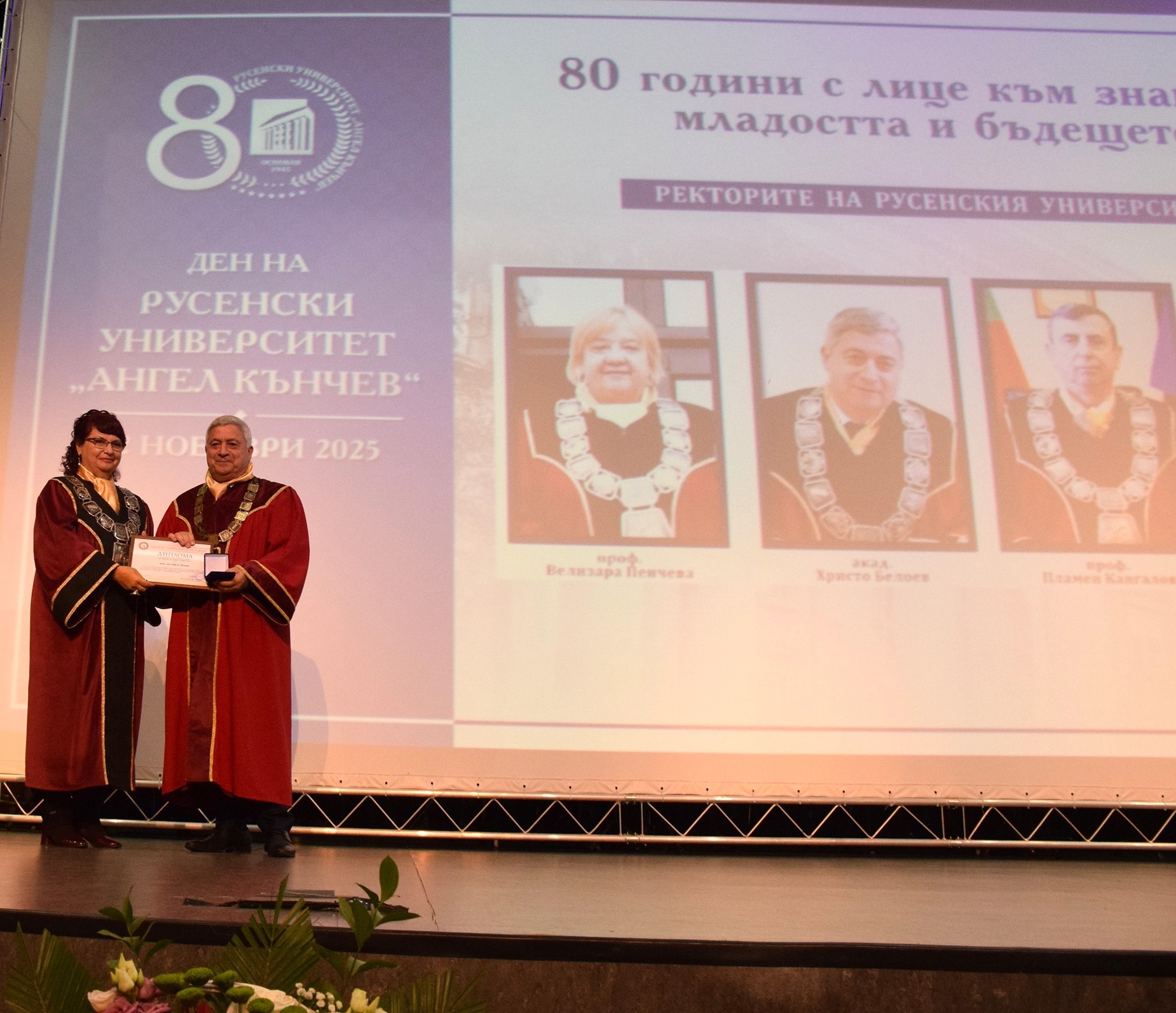 „Отбелязваме не просто 80 години от създаването на нашия университет, а 80 години знание, упорит труд и отдаденост на обществото. Русенският университет винаги е бил двигател на развитието в региона и символ на академичен напредък“, заяви в словото си ректорът на висшето училище доц. д-р Десислава Атанасова.