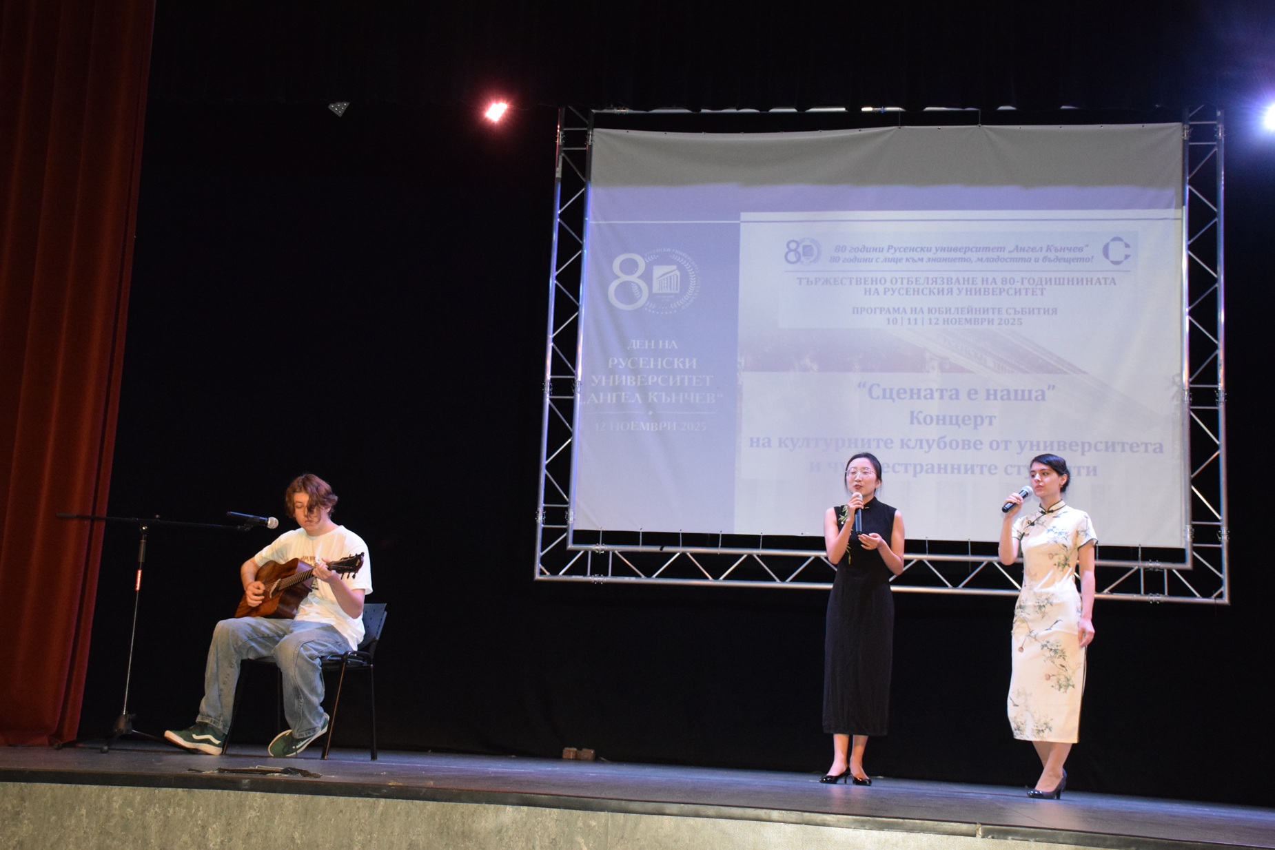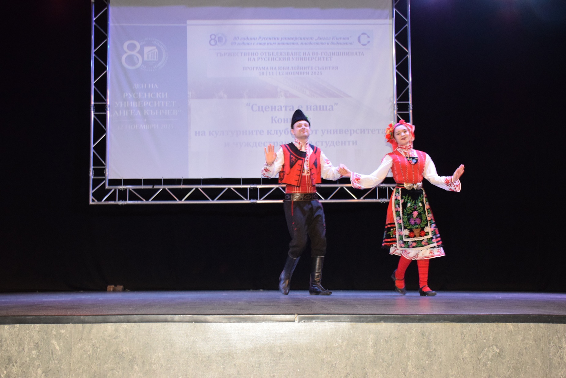 Талантът на студентите от Русенския университет изгрява в голямата зала на „Канев център“ в рамките на събитието „Сцената е наша“, което включва изпълнения на културните клубове от висшето училище, на чуждестранни студенти в него и на обучаващи се по Програма „Еразъм+“.