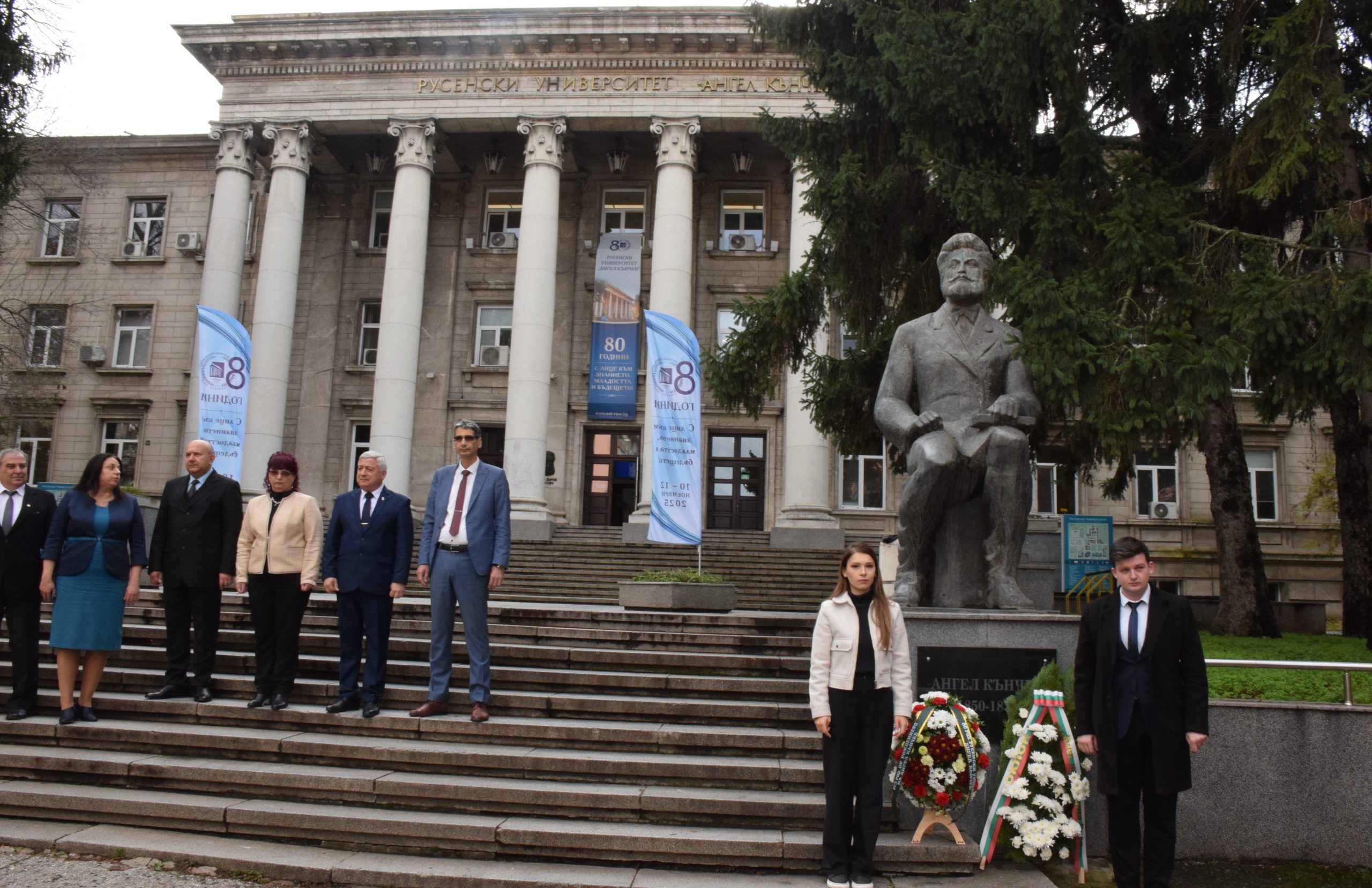 С поредица от събития отбелязва своята 80-годишнина Русенският университет „Ангел Кънчев“. Тържественият ден започва с поднасяне на венци пред паметника на патрона на висшето училище на 12 ноември. Церемонията пред Ректората събира представители на академичното ръководство, преподаватели, служители, студенти и гости на Университета.